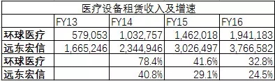 單獨抽取兩者在醫療設備租賃業務方面的數據,環球醫療的平均業務增速更高,這說明環球醫療相對遠東宏信在醫療租賃業務上存在相當的競爭優勢。